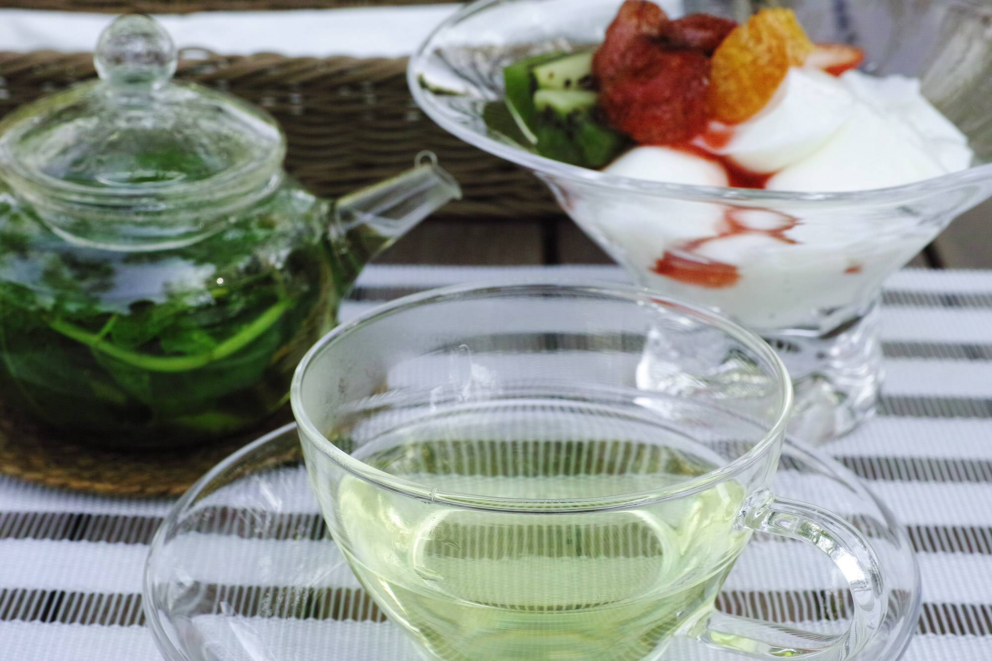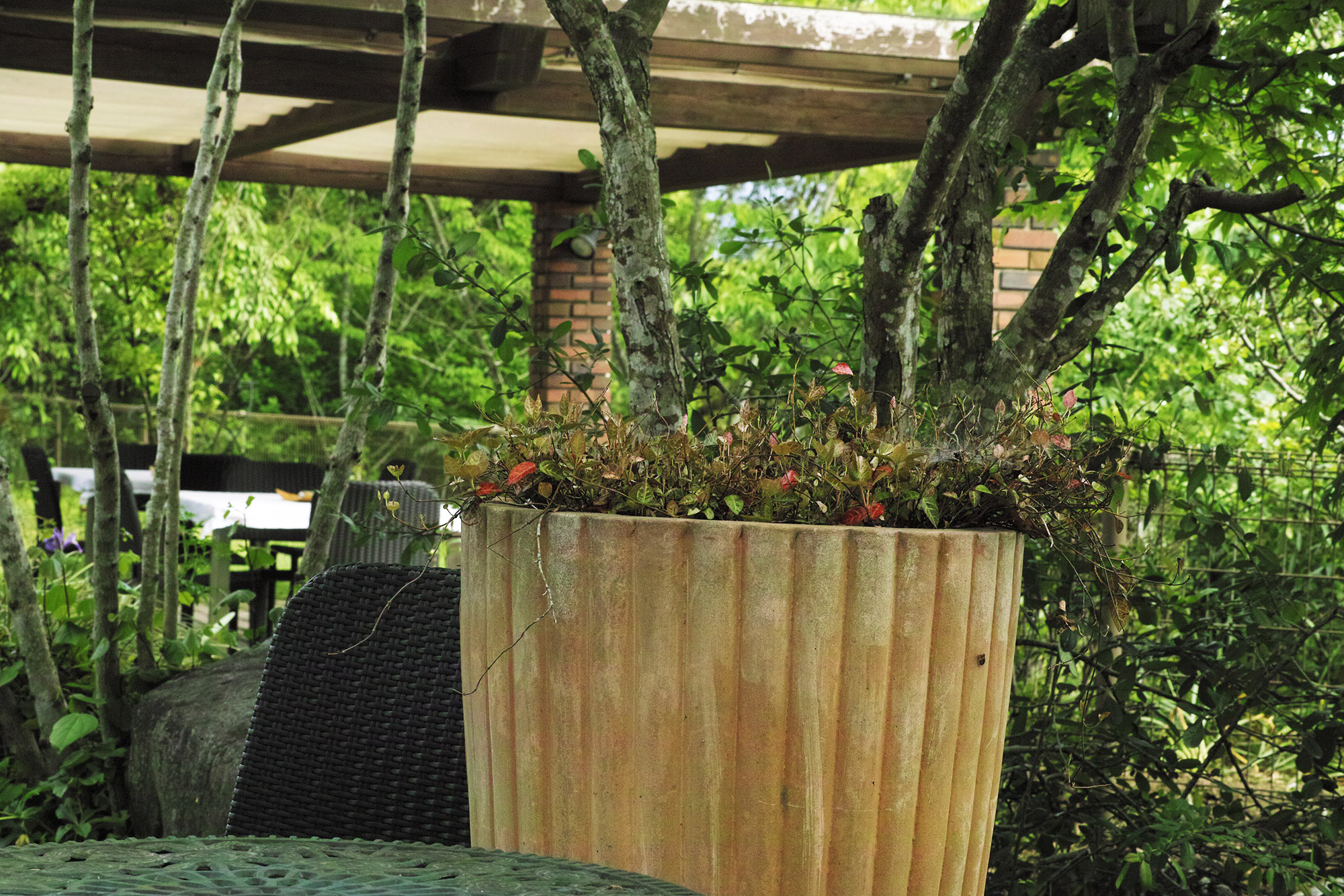 石蔵のギャラリーと緑のあふれるお庭を過ぎてカフェに行くと、テラス席もOKですと言われたので、ひろいお庭の一角の席をいただきました。