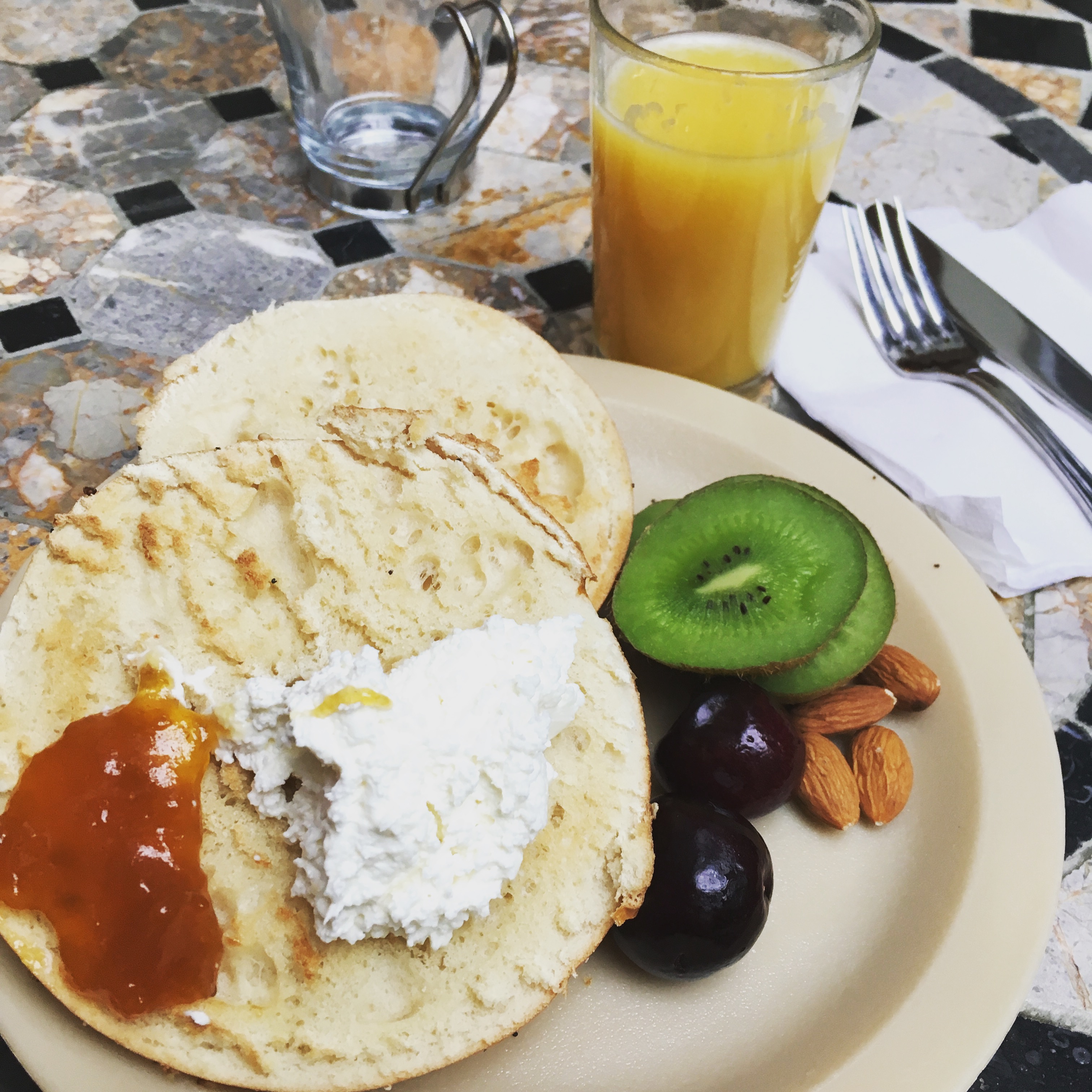 よく、ベーグルにクリームチーズとジャムを挟んでいただきました。フルーツも毎日種類が変わって、長期滞在でも飽きないと思います。