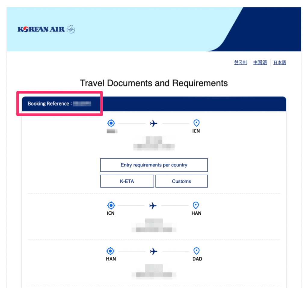 [Korean Air] Travel Documents and Requirements というタイトルで、搭乗便と入国に必要な書類の案内が書いてあるメールでしたが、その中に大韓航空の予約番号が書かれていました。